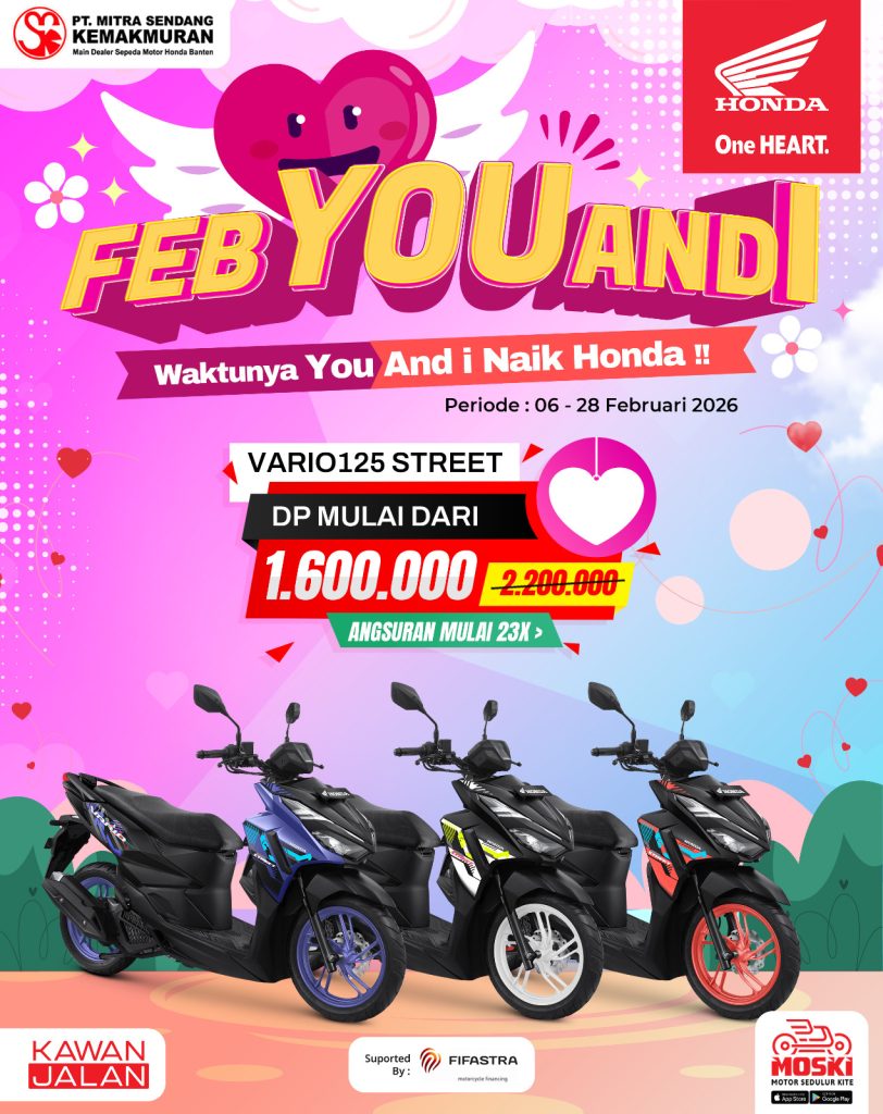 Program “FEB YOU AND I” berlaku 01–28 Februari 2026. Khusus Vario125 Street berlaku 06–28 Februari 2026.